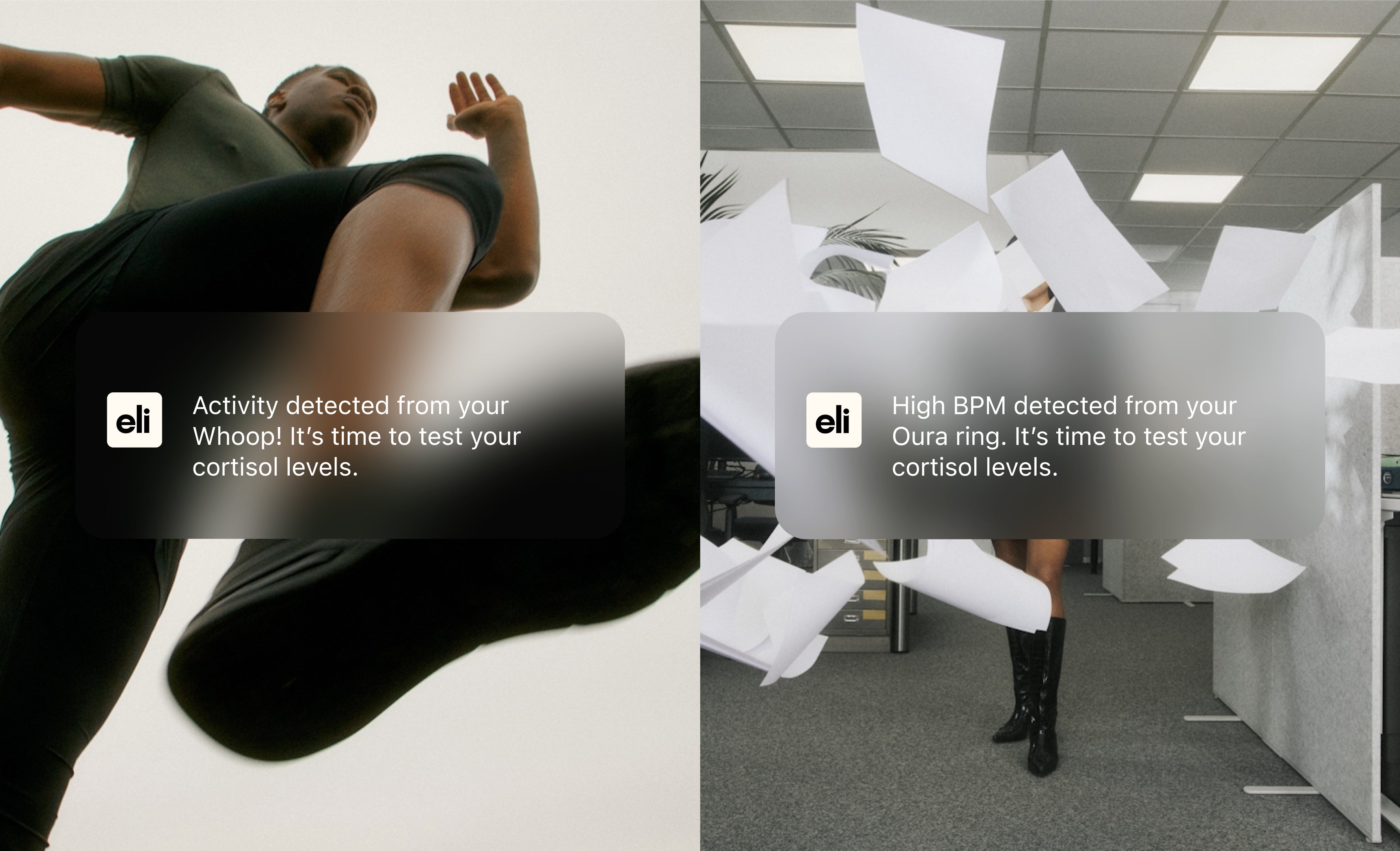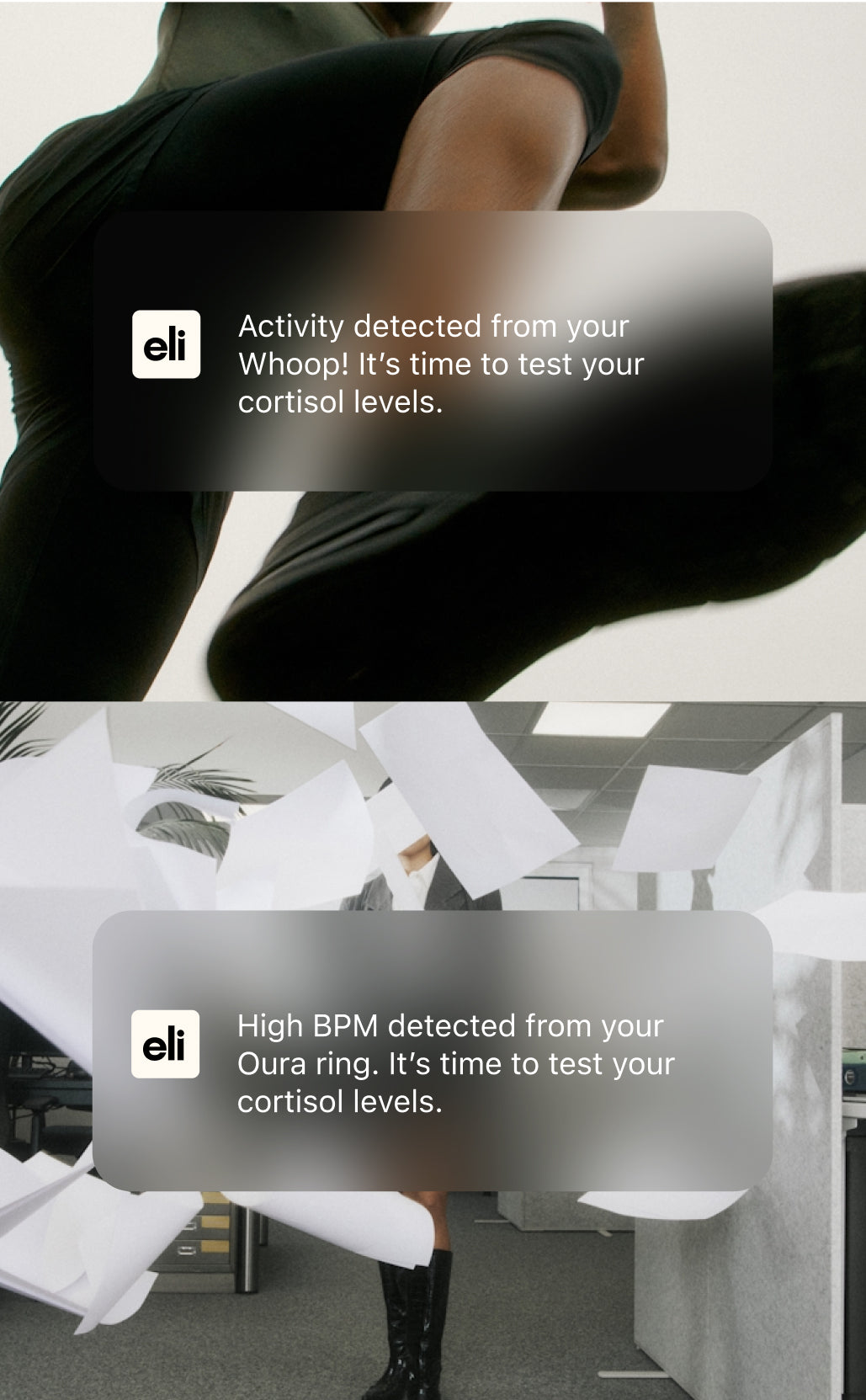 Eli connects your hormone data with activity tracking from Apple Health, Garmin, Oura, Strava, and more. Finally see the drivers of your stress response—from spike to recovery—in one real-time view.