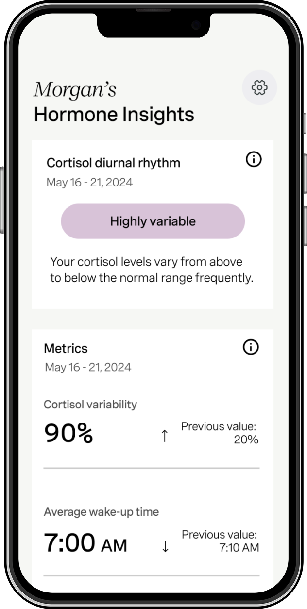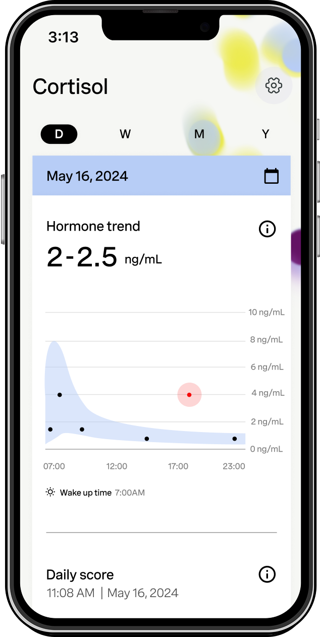 Hormometer™ is the first at-home hormone testing system that captures cortisol fluctuations in real-time. No mail-away blood draws or 24-hour urine tests make this level of data accessible.